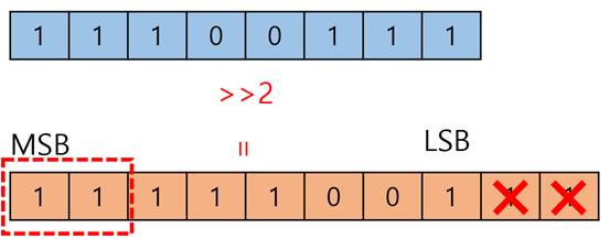 >>는 비트를 오른쪽으로 이동시키는 연산자로써 왼쪽에 새로 생기는 비트는 원래 비트가 양수일 경우 0으로 채워지고 음수일 경우 1로 채워진다.