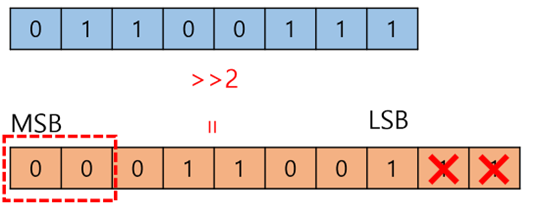 0000_1000(8)을 >>2 해주면 비트가 오른쪽으로 두 칸 움직여 0000_0010(2)이 된다.