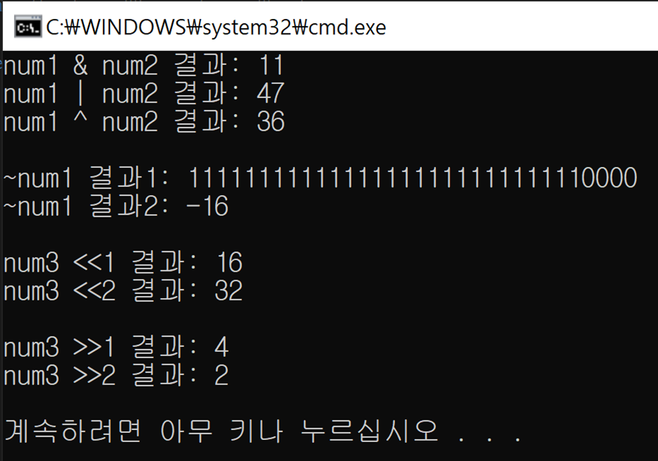 Console.WriteLine("num1 | num2 결과: " + (num1 | num2)); //47