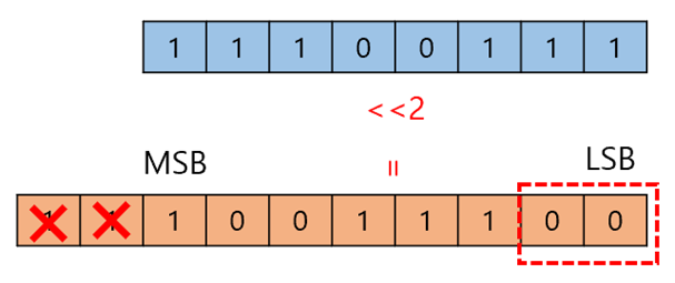 위의 예제에서는 8bit 데이터형으로 가정하여 MSB를 넘은 비트는 삭제된다.