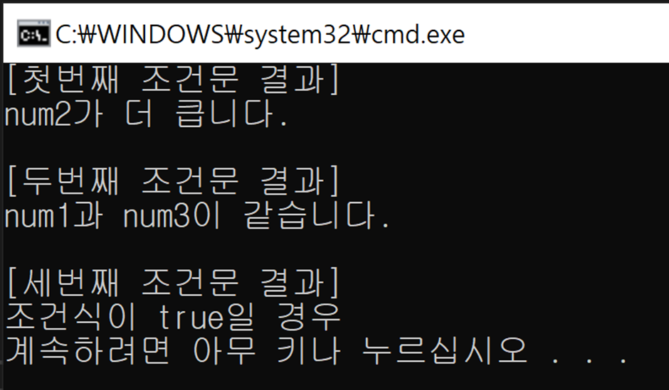 첫번째의 조건문의 경우 if문의 조건식에서 num2가 num1보다 크므로 참이되어 해당 문장을 출력하였다.