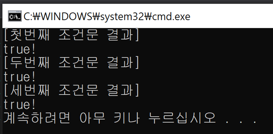 세번째 조건문은 조건시에 true를 넣기만 하여도 조건식이 만족하여 결과를 출력하였다.